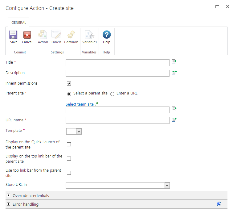 If an override username and password is provided, the workflow action will use the permissions of the provided account to create the site instead.