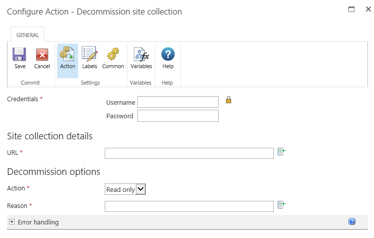 Note: To apply this decommission action, SharePoint requires the workflow to run on the Central Administration site. - No access users cannot access the site, the site collection is not deleted. This option provides an input to specify the reason this action was taken.