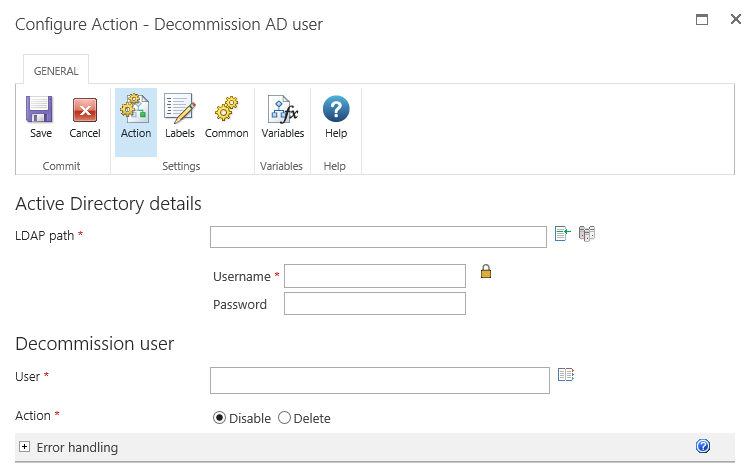 This workflow action will disable or remove a user from an Active Directory store.