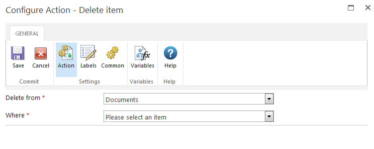 Use the Where field to select which item to delete. The field choices will depend on what was selected in the Delete from drop-down.