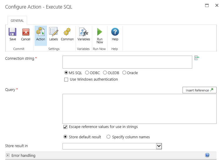This list contains all the workflow variables that can be used to store the result of a SQL ‘select’ query. A collection variable can be used to store multiple records. If a variable that is not a collection is selected, only the first record will be stored. If multiple columns are returned, only the value of the first column will be stored.