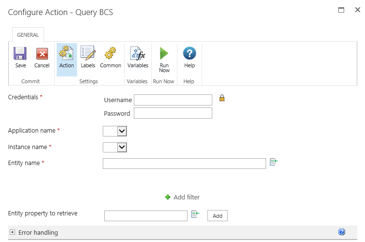 The Query BCS action will retrieve data from the Business Connectivity Service (BCS).