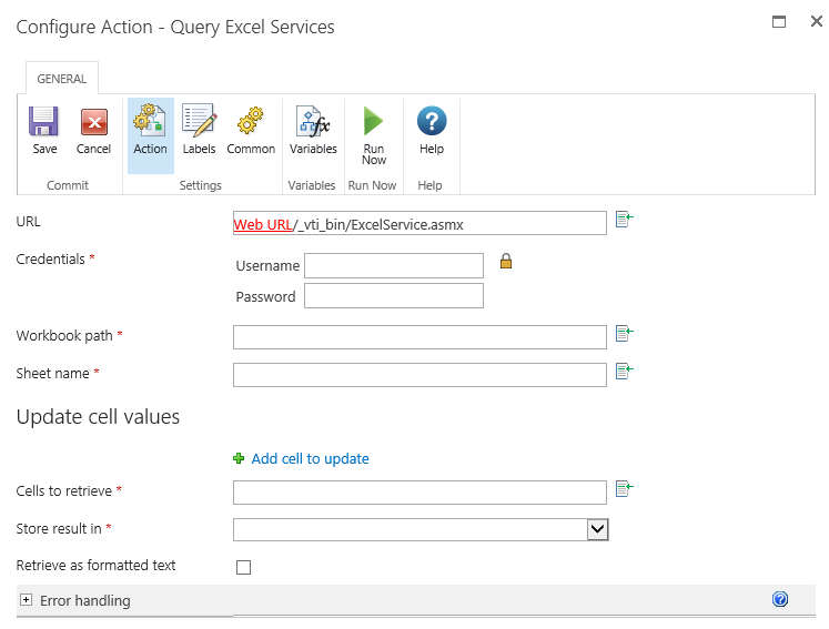 This workflow action will retrieve data from a Microsoft Excel workbook via Excel Services.