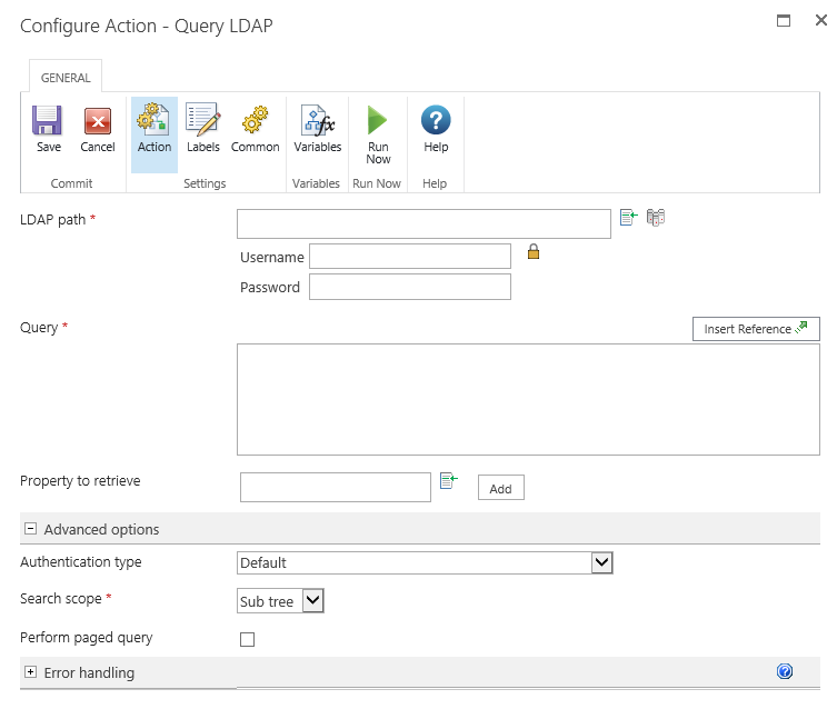 The Query LDAP action allows the workflow to query a LDAP compliant data source such as Microsoft Active Directory. This action is for advanced users.