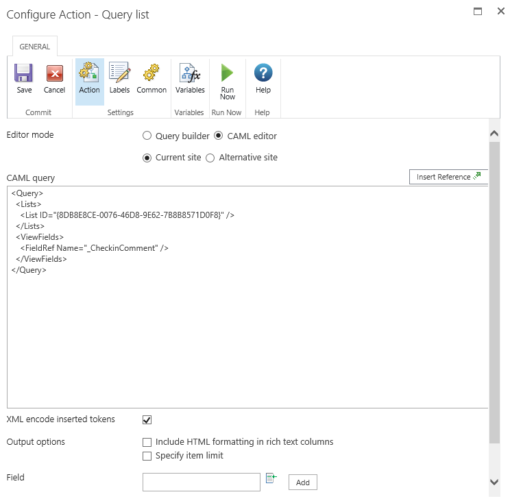 When CAML editor is selected, the query can be run on either the current site or an alternate site to the one the workflow is running in.