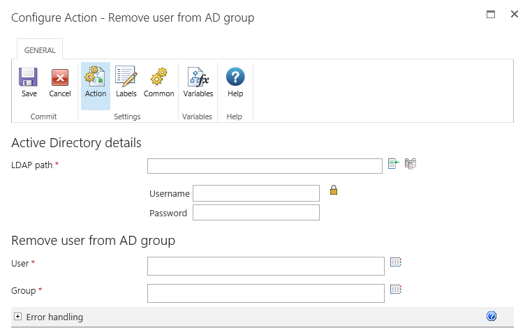 This workflow action will remove a User from an Active Directory security group.