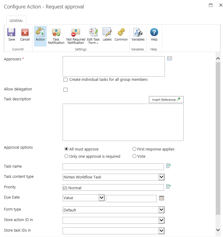 Allows a unique identifier for the action to be stored in an Action ID workflow variable. This identifier can be used to link the action to Delegate Task and Task reminder actions. Please note that the Action ID does not correspond to the ID of the SharePoint task item that is created.