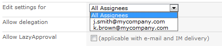 If LazyApproval has been enabled on the server, the workflow can permit the approvers to use LazyApproval. Lazy Approval means that an approval or rejection can be registered when the approver replies to a notification email or an automated OCS / Lync conversation with an approved word or phrase. A system administrator can edit or add to the list of acceptable terms. For more information, please refer to the Managing LazyApproval settings.