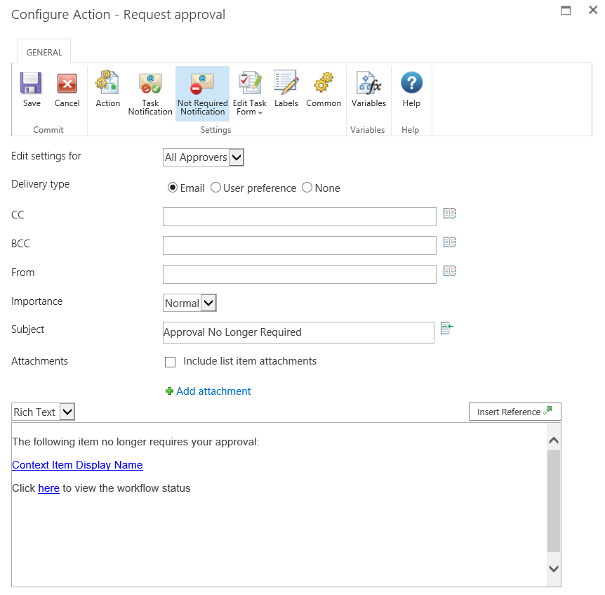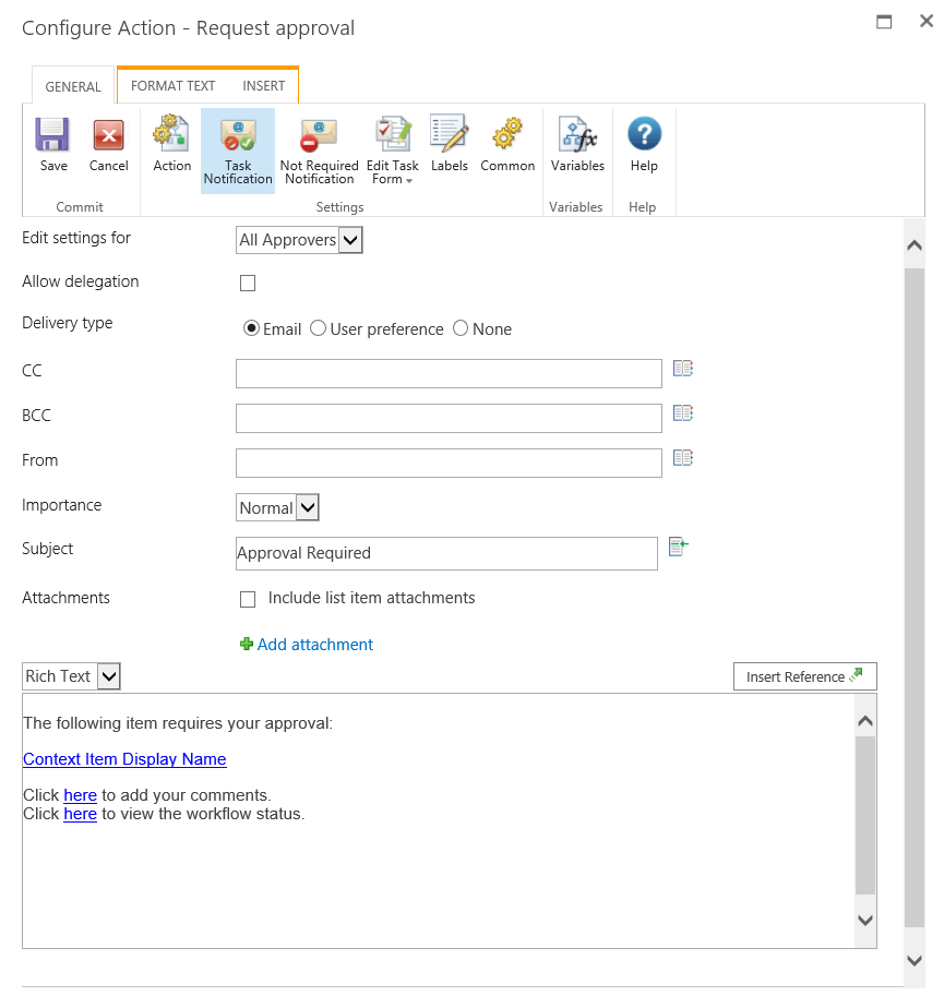 The body of the notification will adapt depending on whether the Rich Text or Plain Text format is selected. Within the space provided enter the content for the notification as straight text, also available are Insert reference fields from within the workflow.