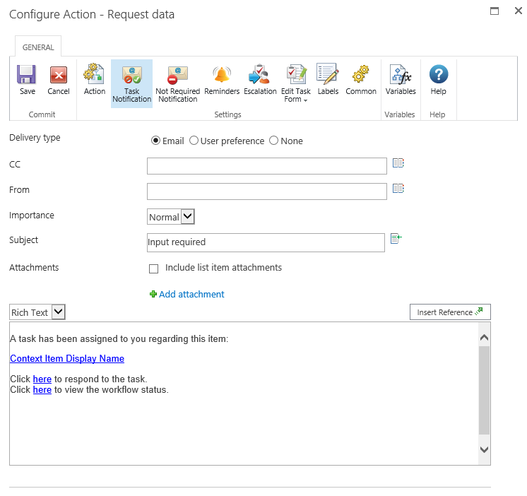 When this option is selected, the user can complete the task by replying to the notification email. The email will contain a basic form, providing a location for the user to enter each requested value. By default, the form is appended to the message body. To control the location of the form, use the following token in the Input Required message: