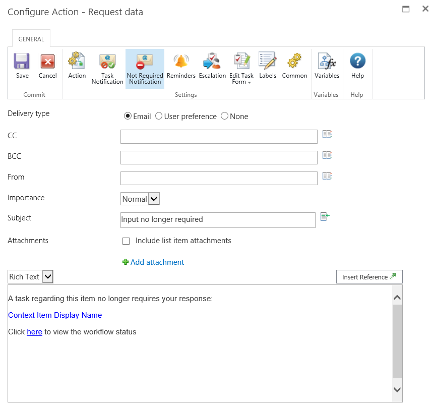 The body of the notification will adapt depending on whether the Rich Text or Plain Text format is selected. Within the space provided enter the content for the notification as straight text and Inserting reference fields from with the workflow.