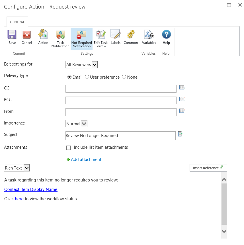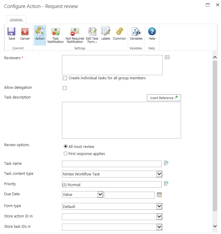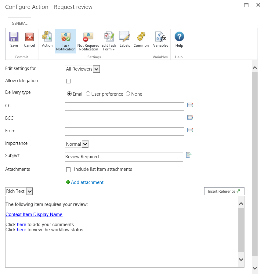 This action is used to assign a task and send a notification to one or more users to review an item as part of the workflow. For more details on the review process please refer to Approving, Rejecting and Reviewing Items.