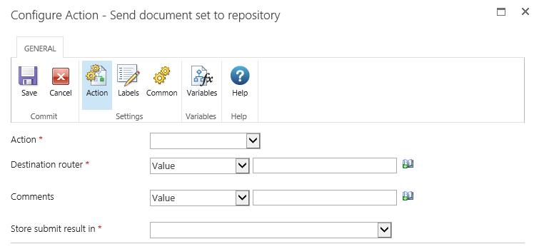 This workflow action can be used to specify by what method and to which repository or records center a document set is sent.