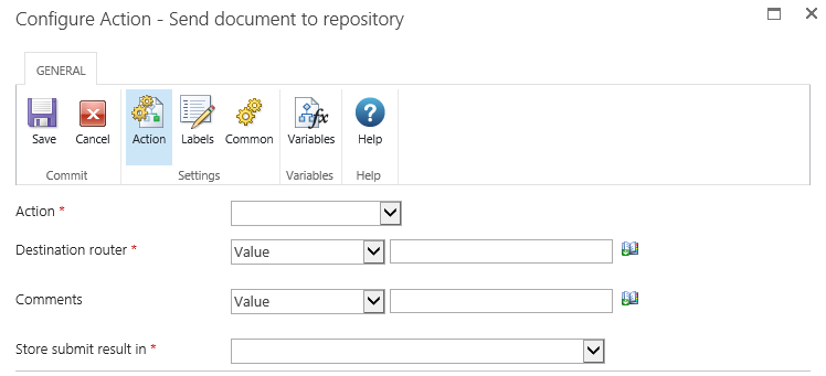 This workflow action can be used to specify by what method and to which repository or records center a document is sent.