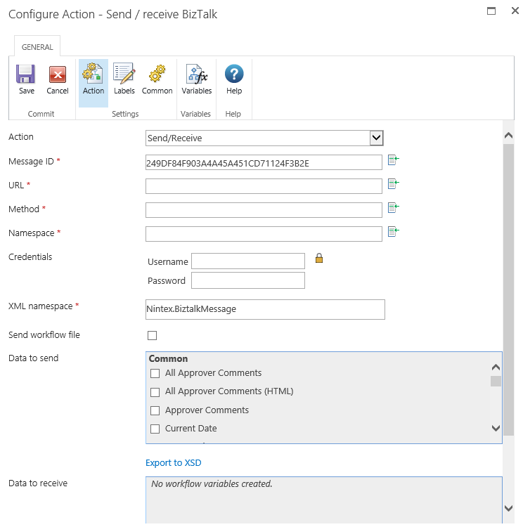 Nintex Workflow generates the schema file for both the 'data to send' and 'data to receive' messages. These schema files can be imported into BizTalk to define messages. Each definition contains a header section containing information used by Nintex Workflow for routing the message and a content section containing the data items specified.