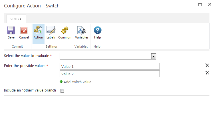 This workflow action directs the flow of actions based on the value of a single variable. A branch for each possible defined value is used to determine which branch of workflow actions will run.