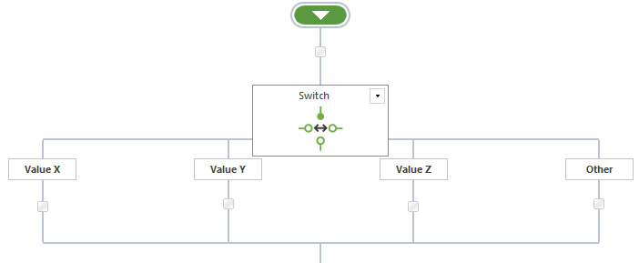 Each time this action runs, either a single child branch or no child branch will execute - the workflow will continue to follow the main path of the workflow if none of the variables return matching values, bypassing the Switch construct completely.