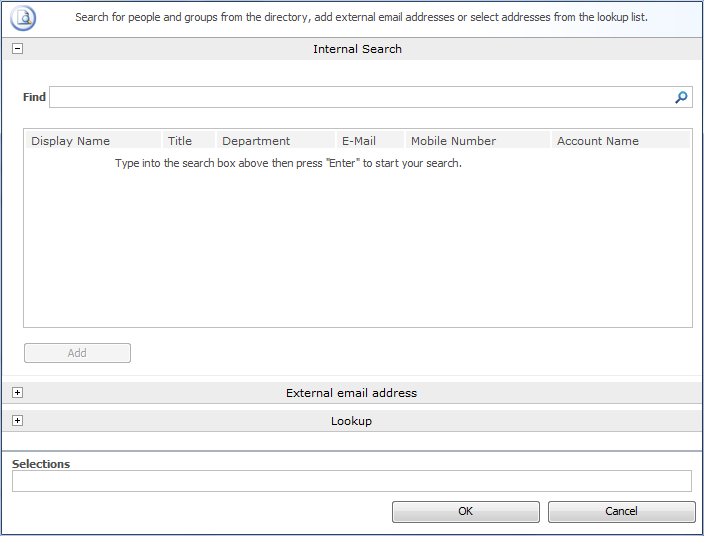 - Internal Search: Entering a partial display name, email or user account name and clicking on the magnifying glass will provide a list of matching users and groups from SharePoint as well as Active Directory.