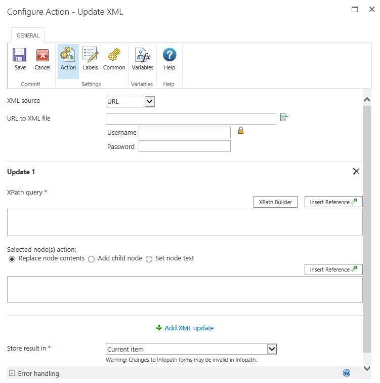 - Current item: The contents of the item on which the workflow is running will be overwritten with the new XML. Use this to update InfoPath form items. This option is available for libraries only.