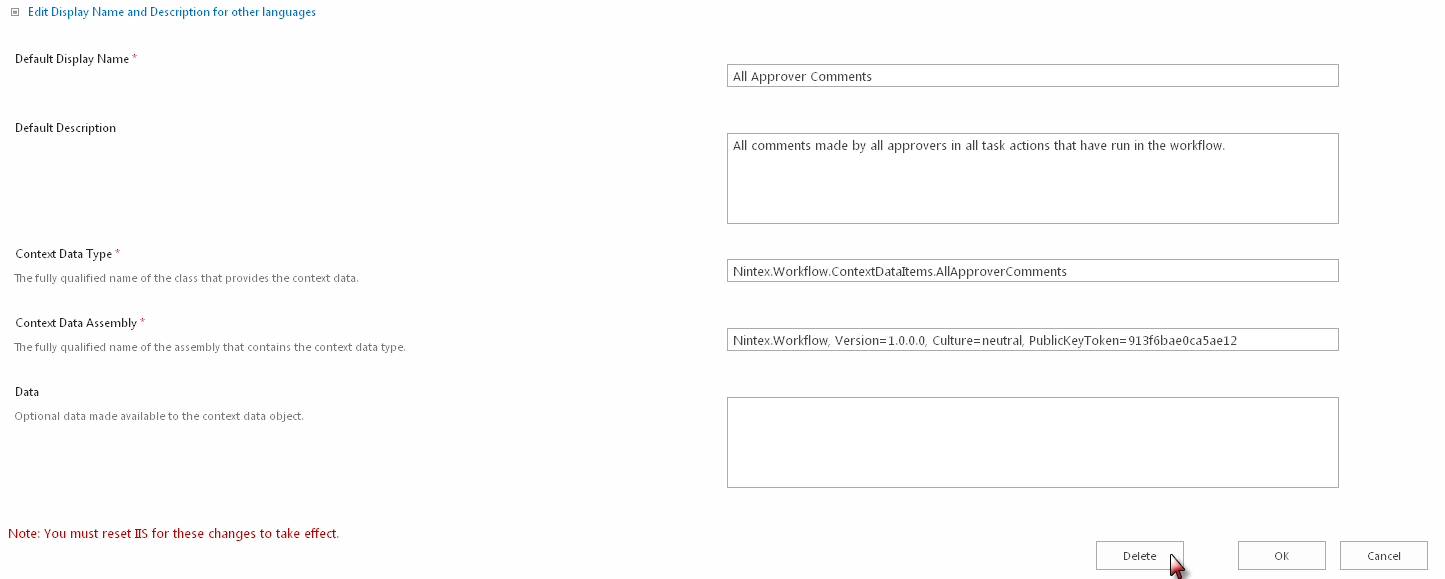 Note: If other languages are available in the SharePoint environment, the Display Name and Description for the Context Data can be set for a specific language. Click on the Edit Display Name and Description for other languages link to edit the details for other languages.
