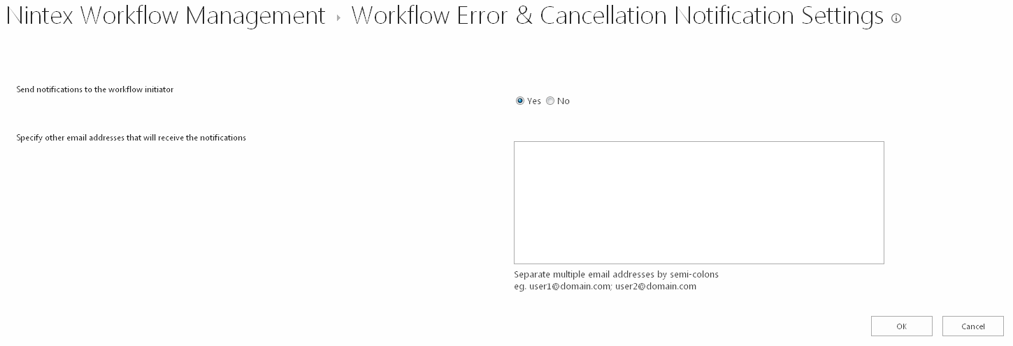 The Workflow error notification settings provides the options to specify to whom workflow error and cancellation notifications are sent.