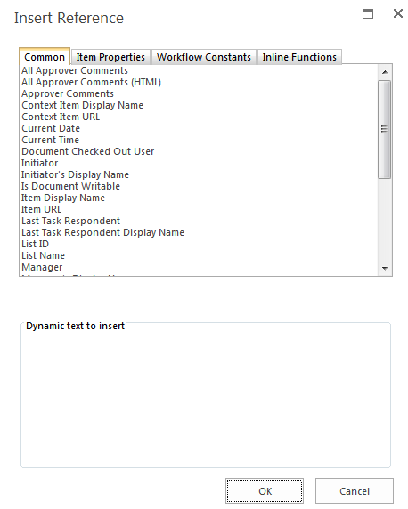 - Common: These are lookup values specific to the workflow, the context of the item and the current task within the workflow.