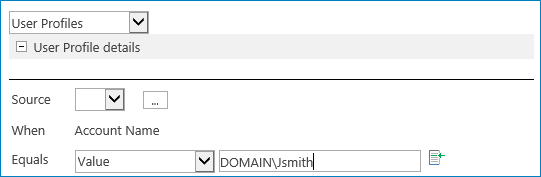 The User Profiles source allows a reference to be made to a user profile property of the specified Account Name. When User Profiles is selected, additional options are provided where the Source and Account Name value will need to be set.