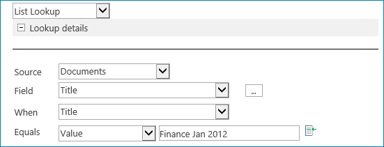 The List Lookup source allows a reference to be made to any property of the current item or any item within a list or library in the current site. When List Lookup is selected, additional options are provided where the Source and Field of the List Lookup will need to be set.