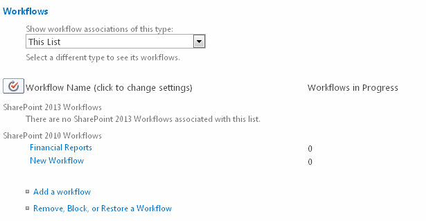 - A list of all published versions of the active workflows within the list or library with the number of currently running workflows are displayed.