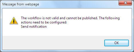 If there are errors in the workflow, including actions that are not configured, the workflow will not publish, and the following message is displayed: