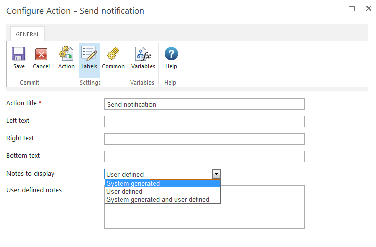 - User defined: Custom notes that can be defined by the user in the User defined notes for the workflow action .