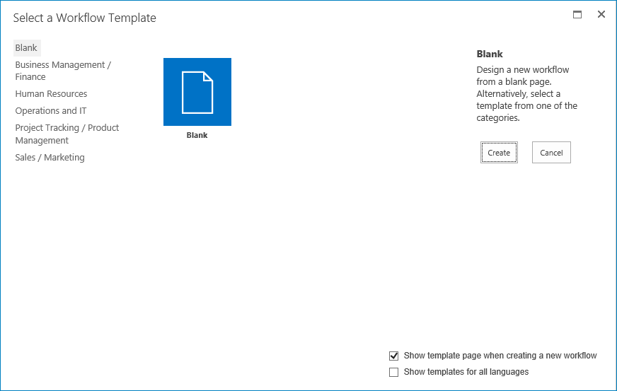 To disable the dialog from appearing each time the Create a Workflow is clicked, uncheck Show template page when creating a new workflow.