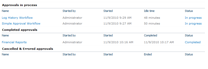 The workflow status page displays the workflows that are currently awaiting approval, have been approved, cancelled and errored.