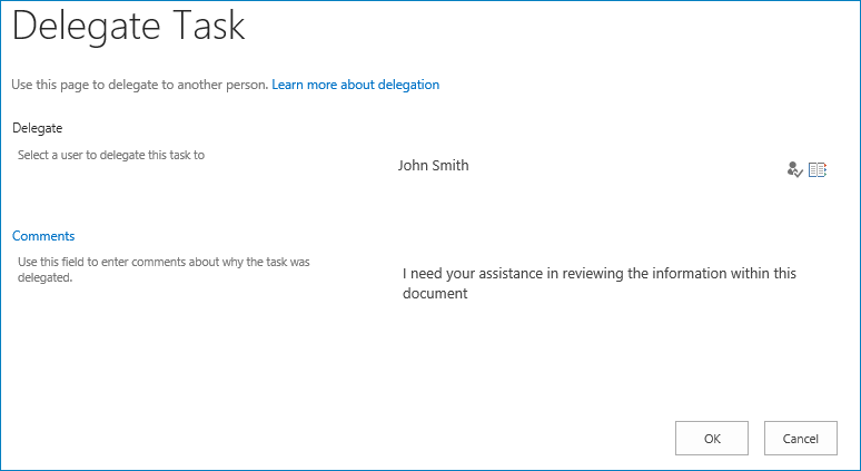- The Comments field is used to provide instructions or additional information to the user the task is being delegated to. This text is appended to the 'Approval Required' notification that is sent to the delegated user.