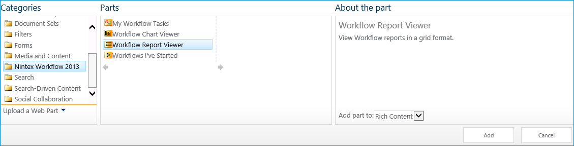 - In the Web Parts section, click on the Workflow Report Viewer.