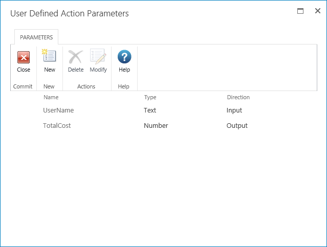 - The User Defined Action Parameters dialog will be displayed listing all of the current workflow parameters that are configured with their type and if it is an input or output field