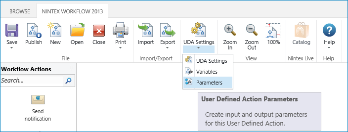 - In the Nintex Workflow Designer, below the UDA Settings in the Ribbon, expand the available options by clicking