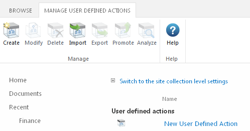 Note: Only Site Administrators, Site Collection Administrators and Farm Administrators can manage User Defined Actions.