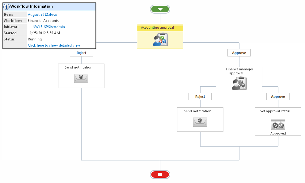 - The workflow will be loaded into the Workflow Viewer, which gives a visual representation of the workflow. A Workflow Information summary is shown in the top left corner. It contains the title of the item in the workflow, the name of the workflow, the initiator of the workflow, the date and time it was initiated and its status. As mentioned above, the possible workflow states are 'Running', 'Completed', 'Cancelled' and 'Errored'.