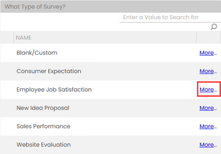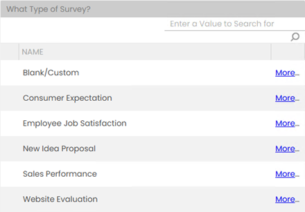 - Blank/Custom: Define your own questions. This option allows you to build your survey questions from scratch.