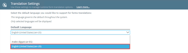 The translation settings for Workspace and Management, Runtime Forms, and Designer can only be set and managed by a user with Admin rights in Management.
