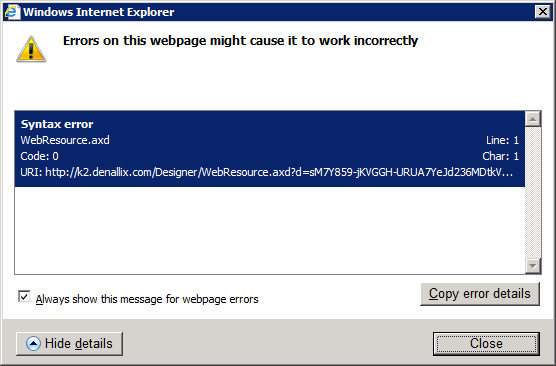 If script debugging is enabled and a syntax error as shown below is displayed relating to WebResource.axd, the following information can be used to determine the cause of the problem.