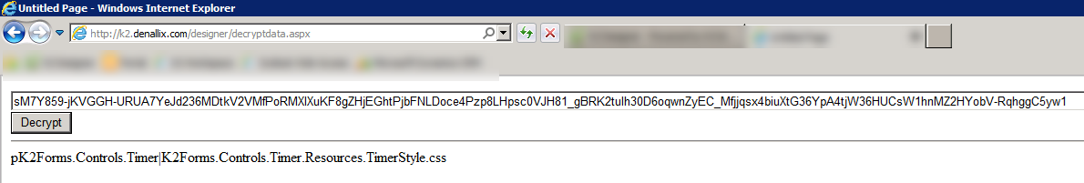 - Paste the value of “d=” from the URL in the error into the textbox and click the Decrypt button: http://k2.denallix.com/Designer/WebResource.axd?d=sM7Y859-jKVGGH-URUA7YeJd236MDtkV2VMfPoRMXIXuKF8gZHjEGhtPjbFNLDoce4Pzp8LHpsc0VJH81_gBRK2tuIh30D6oqwnZyEC_Mfjjqsx4biuXtG36YpA4tjW36HUCsW1hnMZ2HYobV-RqhggC5yw1&t=634717308054218750