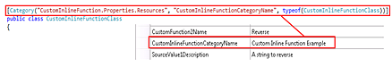 The namespace of this custom function project is MyInlineFunction and a resource string has been defined, MathCategory which contains the name of the category. MyMath is the name of the class that is attributed with this category.
