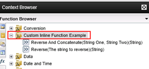 Inline functions allow simple text manipulation, data type conversions, and math and date calculations in the context of a process. These Inline Functions are exposed in the Context Browser of the Workflow design tool. This approach allows process designers to call functions through a declarative, UI-based manner instead of resorting to custom code in server events.