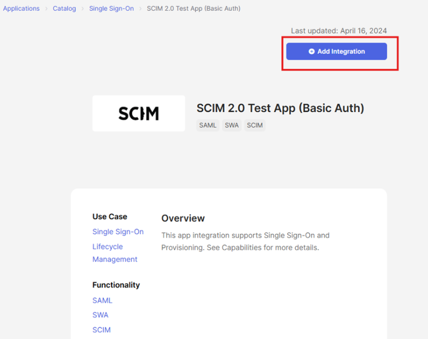 Use this guide to configure and install the SCIM test app in Okta. The app lets you use OAuth 2.0 Authorization Code grant flow as your method of authentication and SCIM as your method of identity provisioning.