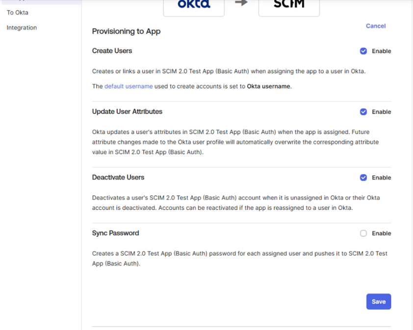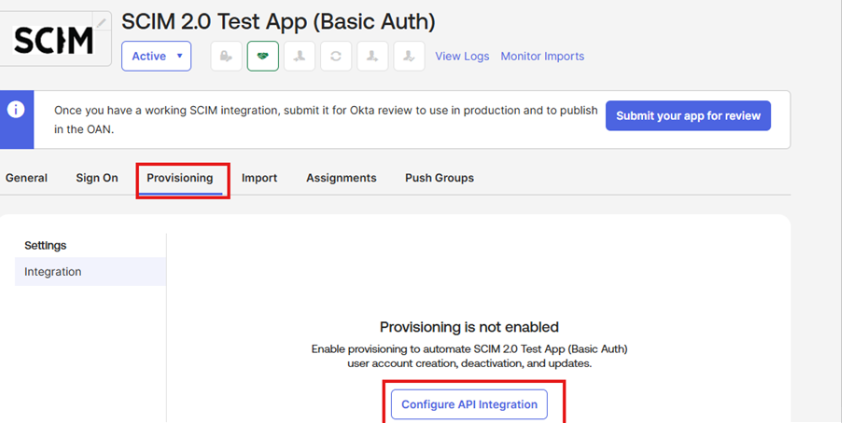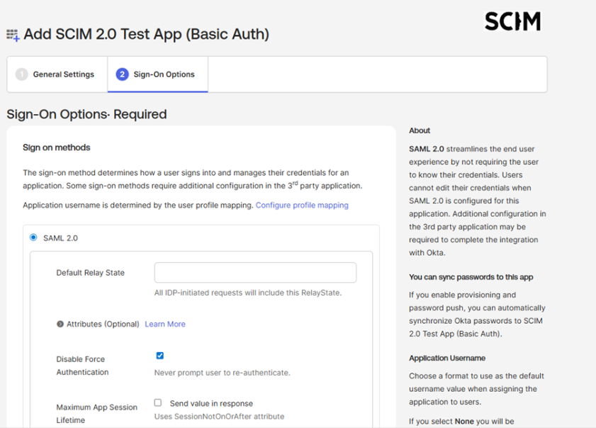 Use these steps to configure the SCIM test app in Okta.