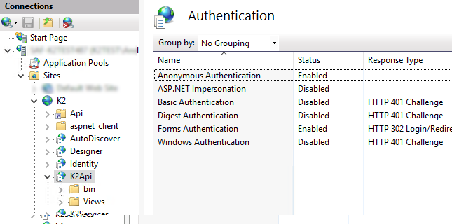 Due to increased security of the SmartForms Designer and Runtime sites, we recommend using Forms or Windows Authentication in IIS, or OAuth when using the K2 API. Basic Authentication may cause authentication errors and authentication "Replay Attacks" when using the K2 API.
