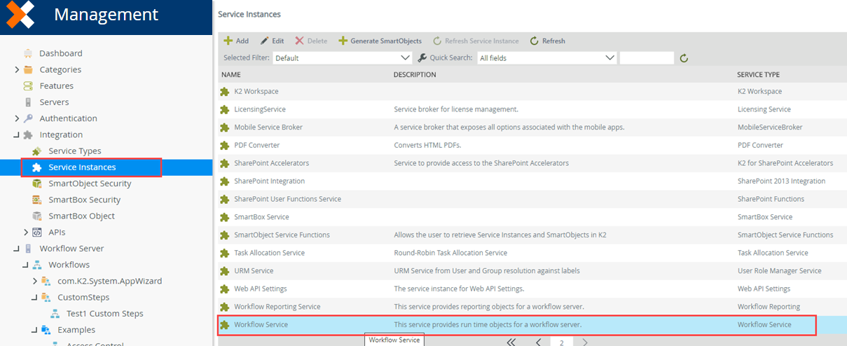 - Use the Service Type column to find an instance of the service type you will create a SmartObject for. In this case, we will use the Workflow Service Service Instance of the Workflow Service Service Type: