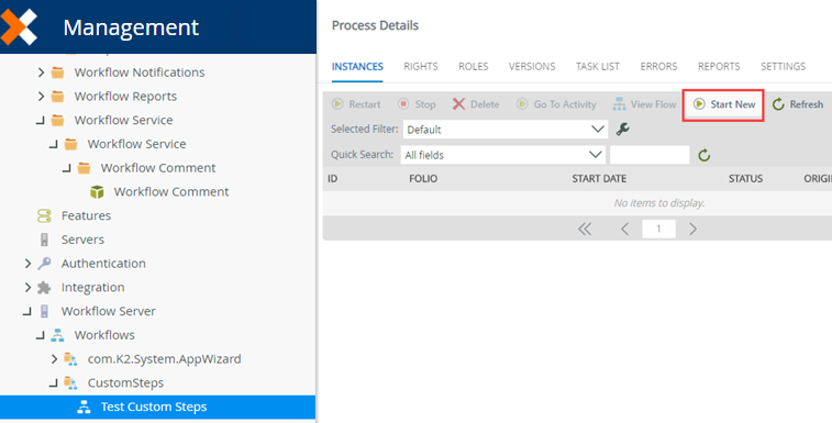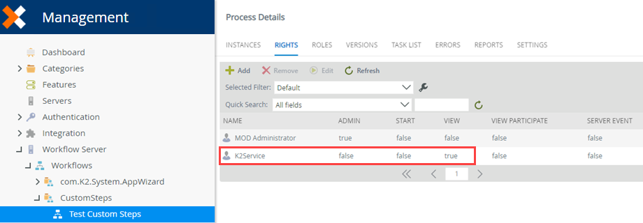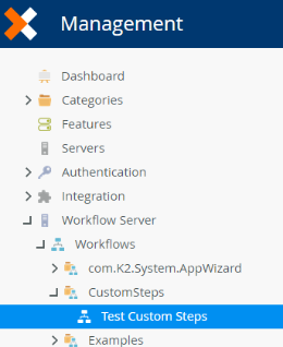 - Remember that workflow steps execute in the context of the Service Account. To add comments to the workflow instance, the Service Account requires View permission on the workflow. Launch Management and navigate to the workflow you just deployed. In this example, the workflow is located at Workflow Server > Workflows > CustomSteps > Test Custom Steps